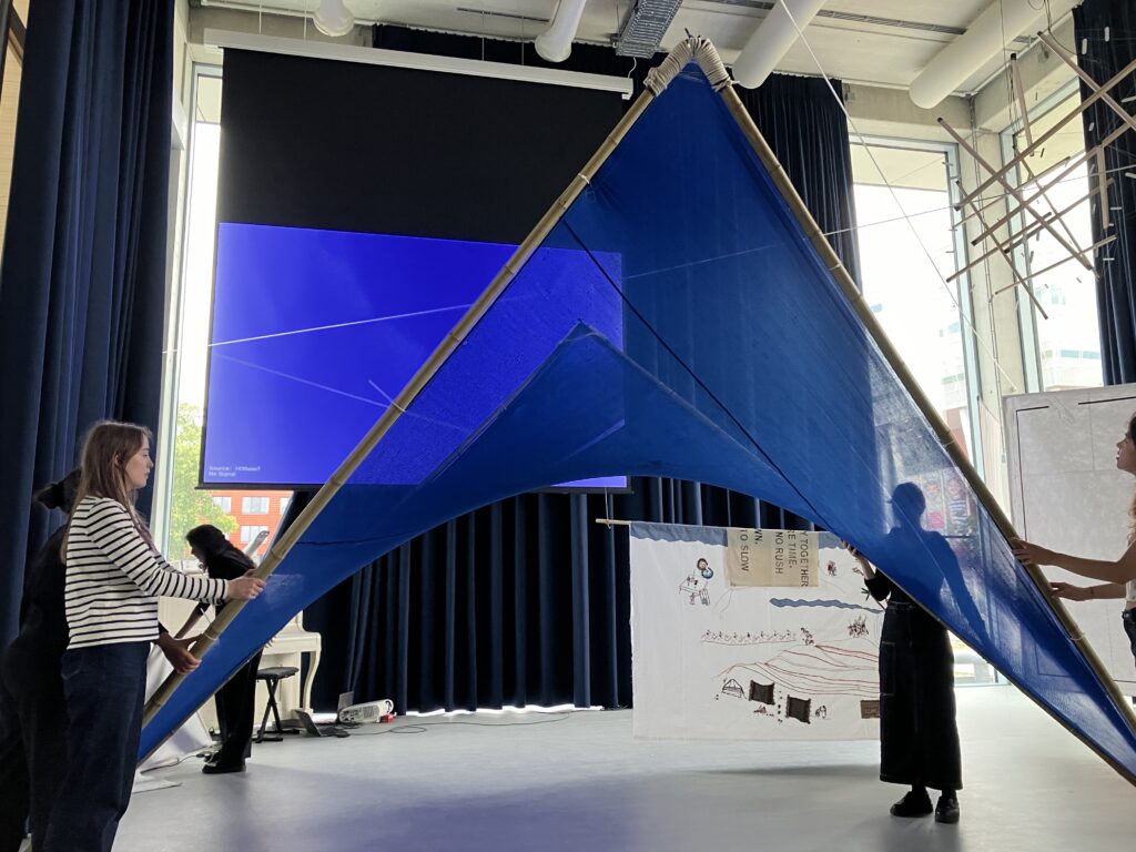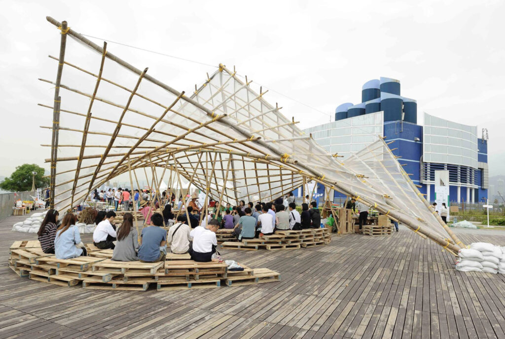 Students testing a wood structure at a Free Zone at TU Delft University Campus.